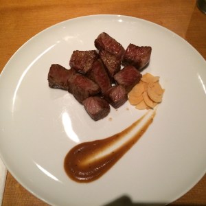 Thus taxi got us swiftly to Itoh Dining which is one of Nobu Matsuhisha’s restaurants in Gion. What a treat this place was – both for the eyes and the taste! We sat in front of the chef who was cooking for us the dinner. First we got sashimi, then a soup followed by some kind of salmon carpaccio, then fish with veggies from the hot plate and as main course Japanese beef cooked to perfection right in front of us. Ah yes and for desert some freshly baked chocolate cake with ice cream and panna cotta… wow wow wow  hmmmm in Japan i am really getting into troubles with the meal of the week as basically almost every meal could get nominated for it!