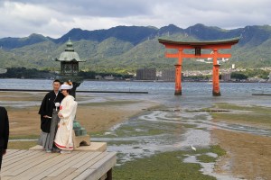 Again a sight which has been added to the UNESCO world heritage ‘collection’ i need to look how many of them are in Japan – i think we have passed already a few of them (also in China.)… The first shrine buildings on Miyajima had been erected in the 6th century. The present version dates from mid 16th century. Thus it is either by co-incidence or not that it is about 16m high and truly impressive if the sun intensifies the bright color. The view of the gate with the island’s Mt. Misen in the back is allegedly one of the ‘three views of Japan’. The difficult part of this sight is actually only the tide – besides the fact to first figure out which train you have to take – because the nicest it looks at high tide. On the day of our visit, hight tide was at 07:00h, thus we made it there around 10:15h which was just ok.. but water was already drifting away. Still we managed to make pictures without anybody walking on the beach and without all the seaweed. Instead we could include a newly married couple in our ‘shots’.